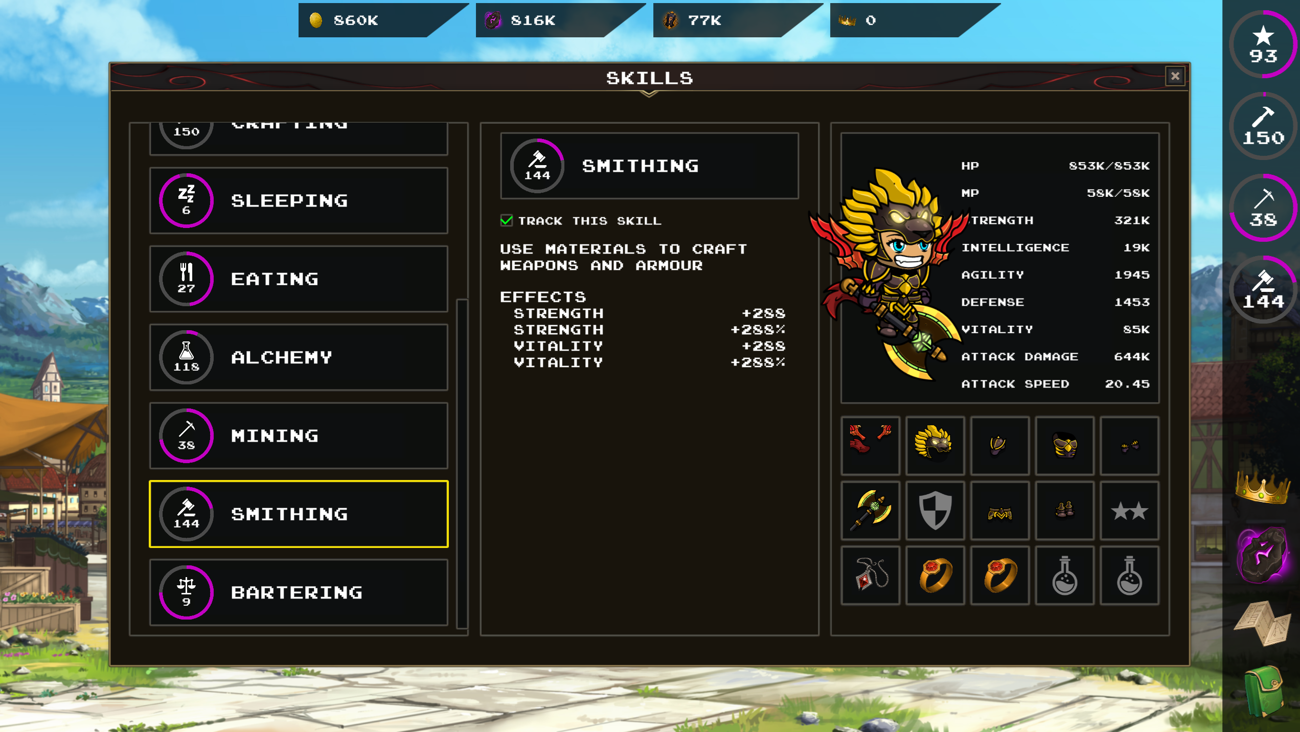 Grindaria is a semi-idle game where you gather, craft, fight monsters, and level up.